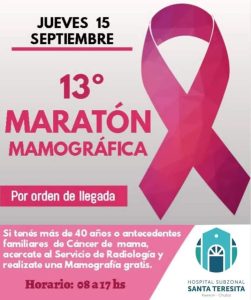 Este jueves 15 de septiembre, se realizará, de 8 a 17, la 13º Maratón Mamográfica en el Hospital “Santa Teresita” de Rawson. La misma será gratuita y se atenderá por orden de llegada.