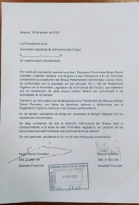 El contenido de la nota enviada a la Presidencia de la cámara de legisladores chubutense, reza : “Nos dirigimos a esa Presidencia a fin decomunicar formalmente la constitución del Bloque Parlamentario denominado Chubut Unido”, señalaron González y Tamame. Agrando además que “se hace saber que se designará como Presidente/a del bloque a Sergio Daniel González, con todos los derechos, deberes y atribuciones que el Reglamento Orgánico reconoce a los bloques parlamentarios”, expresa el primer parrafo de la comuniocación