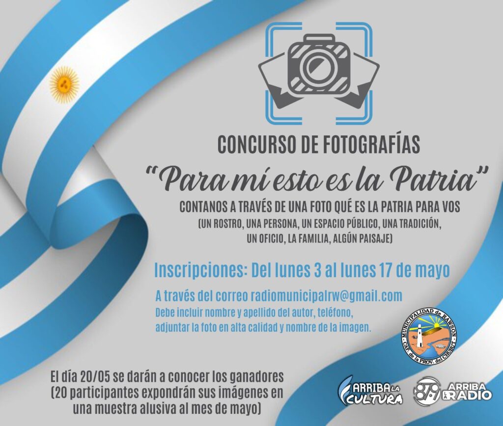 El municipio de Rawson; a través de la Secretaría de Turismo, Cultura, Deportes y Comunicación; comunica que desde el 3 al 17 de mayo estarán abiertas las inscripciones para el concurso de fotografías “Para mi esto es la patria”, que se organiza por la Semana de Mayo.