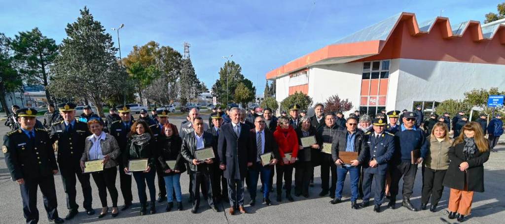 En el acto que se desarrolló en la explanada de la Jefatura de Policía del Chubut, el mandatario provincial estuvo acompañado por los ministros de Gobierno y Justicia, Cristian Ayala; de Seguridad, Miguel Castro; de Ambiente, Roberto Jure; los subsecretarios de Prevención y Participación Comunitaria, Sandra Muñoz; de Coordinación de Gestión, Alejandra Paz; de Seguridad Vial (APSV), Pablo González; el jefe de Policía de la Provincia, Comisario General Cesar Brandt; el subjefe de Policía, Comisario General, Juan Campos y distintos integrantes de la Plana Mayor de la Policía del Chubut; las divisiones de motos, canes, personal de comando, la Banda de Música de la fuerza y familiares del personal reconocido.