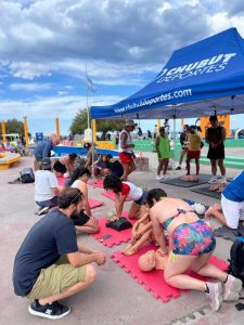 Por primera vez, el Cuerpo Estable Municipal de Guardavidas de Playa Unión, junto con alumnos del curso profesional de Guardavidas del CFP N° 650, abrió la capacitación al público general. La jornada incluyó la enseñanza de RCP y técnicas de obstrucción de vía aérea por cuerpo extraño (OVACE) para todas las edades.