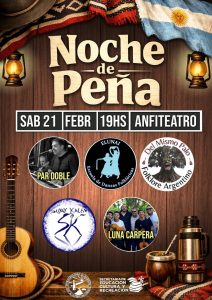 El sábado 21 será el turno de la “Noche de Peña”, que reunirá a músicos y ballets de trayectoria en el ámbito local. Contará con las presentaciones de Par Doble; la Escuela de Danzas Folklóricas “Elunai”; el grupo Del Mismo Palo; el ballet Suyay Kalén y Luna Carpera, quienes ofrecerán un variado repertorio de música y danza tradicional.