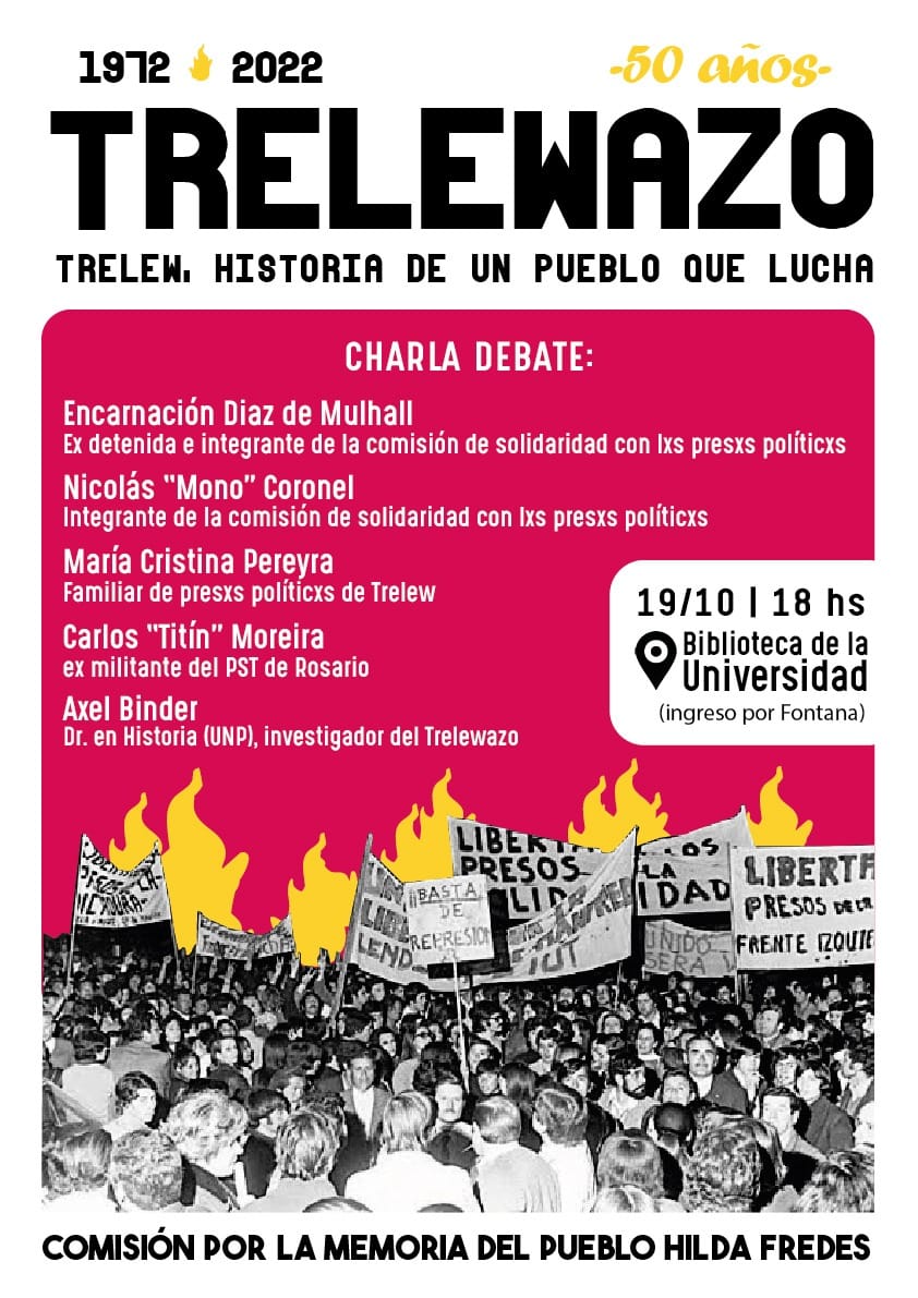 La Comisión por la Memoria del Pueblo “Hilda Fredes”, invita a participar de la charla debate que se realizará el próximo miércoles 19 de octubre, en la Biblioteca Gabriel Puentes de la Universidad, a 50 años de la Asamblea del Pueblo, conocida como Trelewazo.