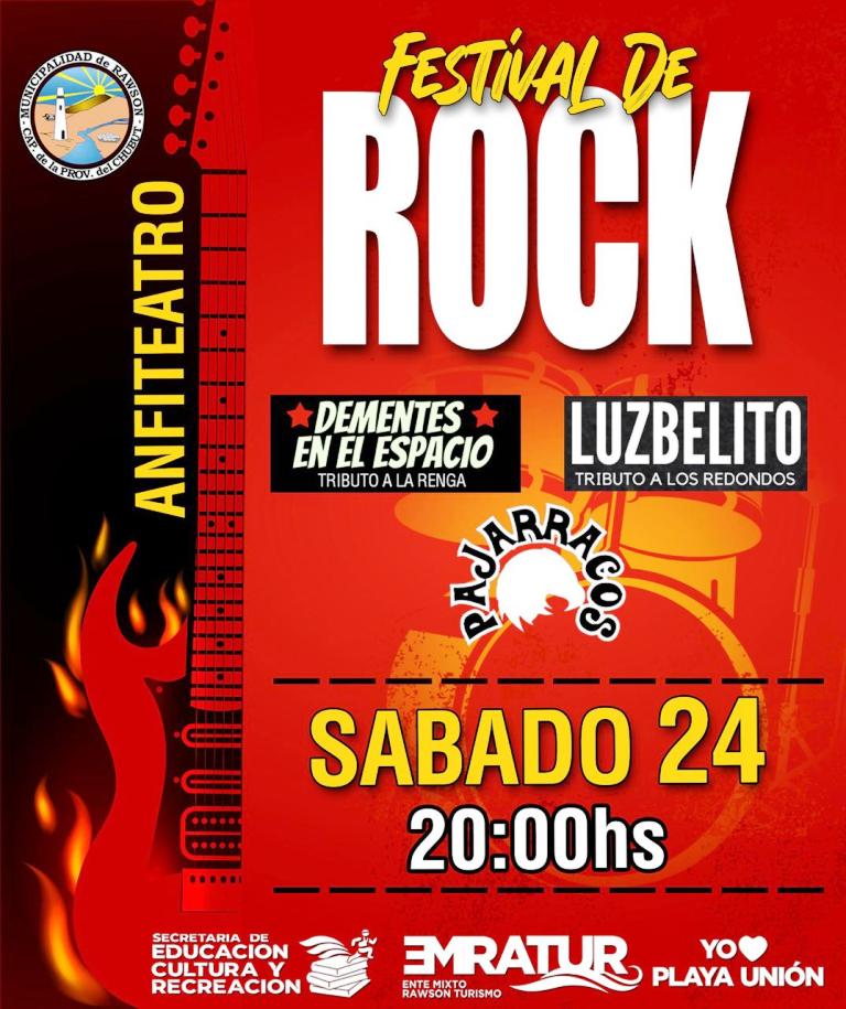 La Municipalidad de Rawson, a través de la Secretaría de Educación, Cultura y Recreación, invita a los vecinos y visitantes este 24 de febrero desde las 20 horas en el Anfiteatro de Playa Unión, a disfrutar de los tributos a reconocidas bandas de rock nacional.