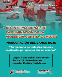En el marco del Día Internacional de la Eliminación de la Violencia contra la Mujer, la Municipalidad de Rawson, a través del Área de la Mujer, Género y Diversidad, realizará una intervención simbólica con la inauguración del Banco Rojo, como parte de una agenda de actividades comunitarias destinadas a promover la sensibilización, la reflexión y la prevención de la violencia de género.