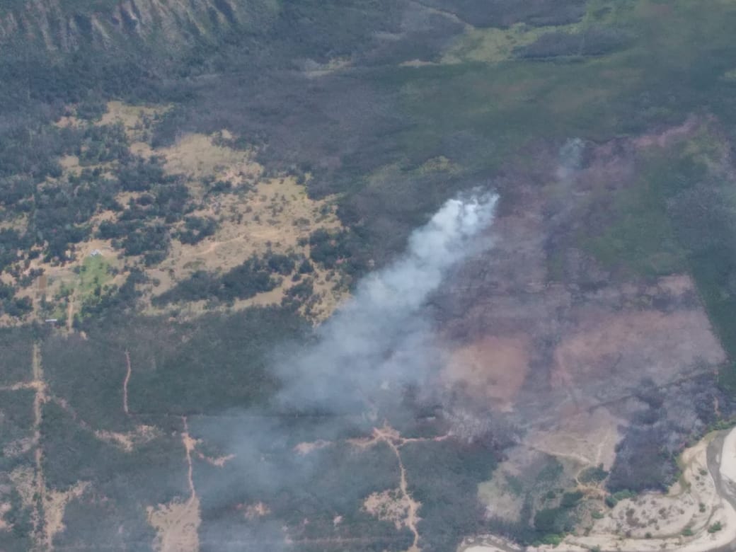 Una topadora del SPFM realizó una faja cortafuego para proteger la vivienda de un poblador. Personal del SPMF hizo además un sobrevuelo con un avión aportado por el SNMF para evaluar el estado de situación del siniestro.