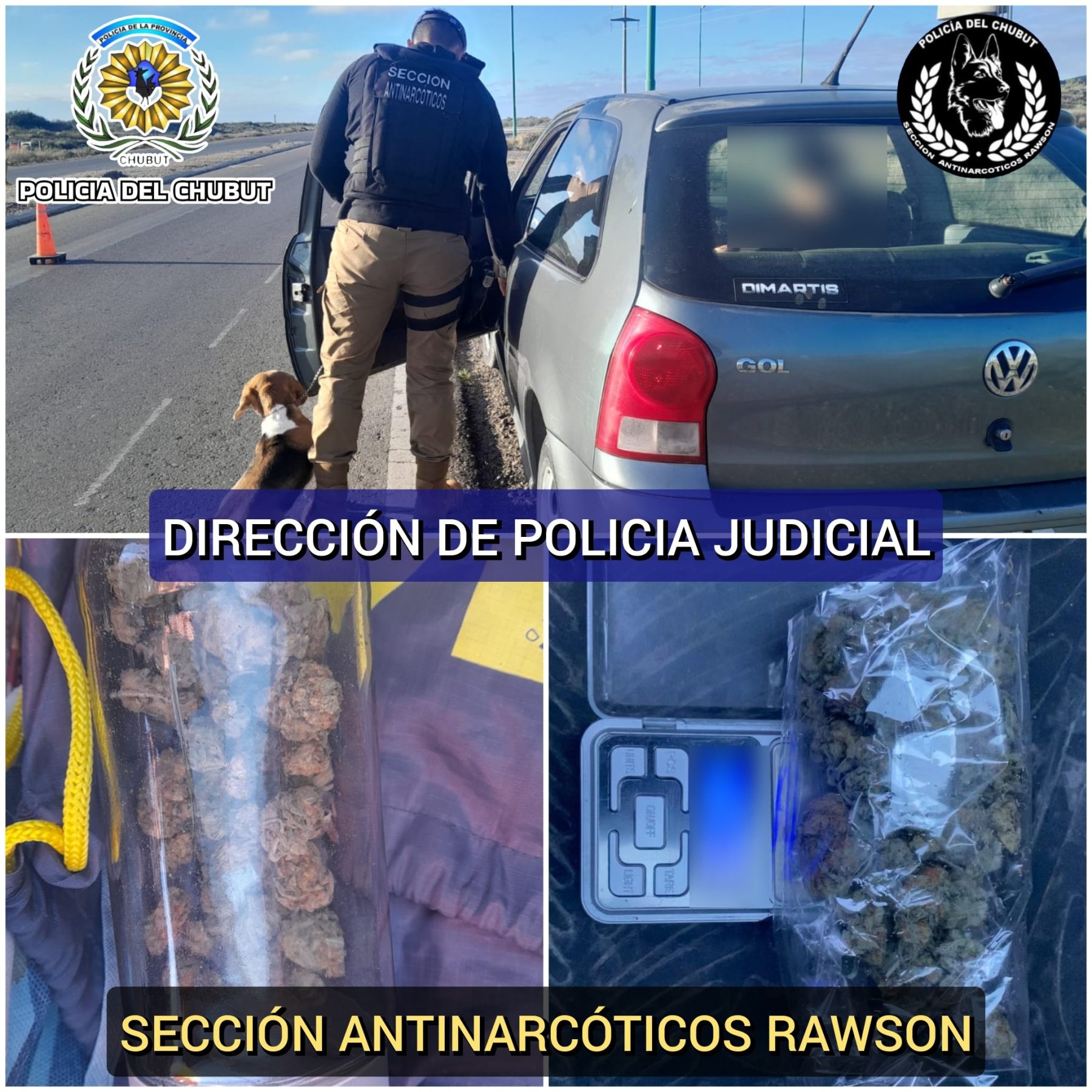 Personal de la Sección Antinarcóticos Rawson que se encontraba realizando control vehicular y de personas en puesto policial Magagna y en el puesto 604, procede a controlar un vehiculo Volkswagen modelo Gol, El can “UMMA” de esta División realiza marcacion positiva en el vehiculo. De manera voluntaria el conductor hace entrega de las sustancia estupefaciente “cannabis sativa”.