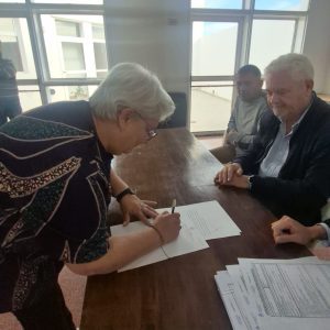El acto de firma de las primeras escrituras se realizó este martes por la mañana en el Núcleo Integral de Desarrollo de Oportunidades (NIDO), en el barrio Ruca Hue de la ciudad del Golfo Nuevo, y de la actividad participaron el presidente del IPV, Guillermo Espada James; el escribano del organismo provincial, Ignacio Lleral; el presidente del barrio Luis Calfuman; además de vecinos y autoridades de la Delegación del Instituto en Puerto Madryn.