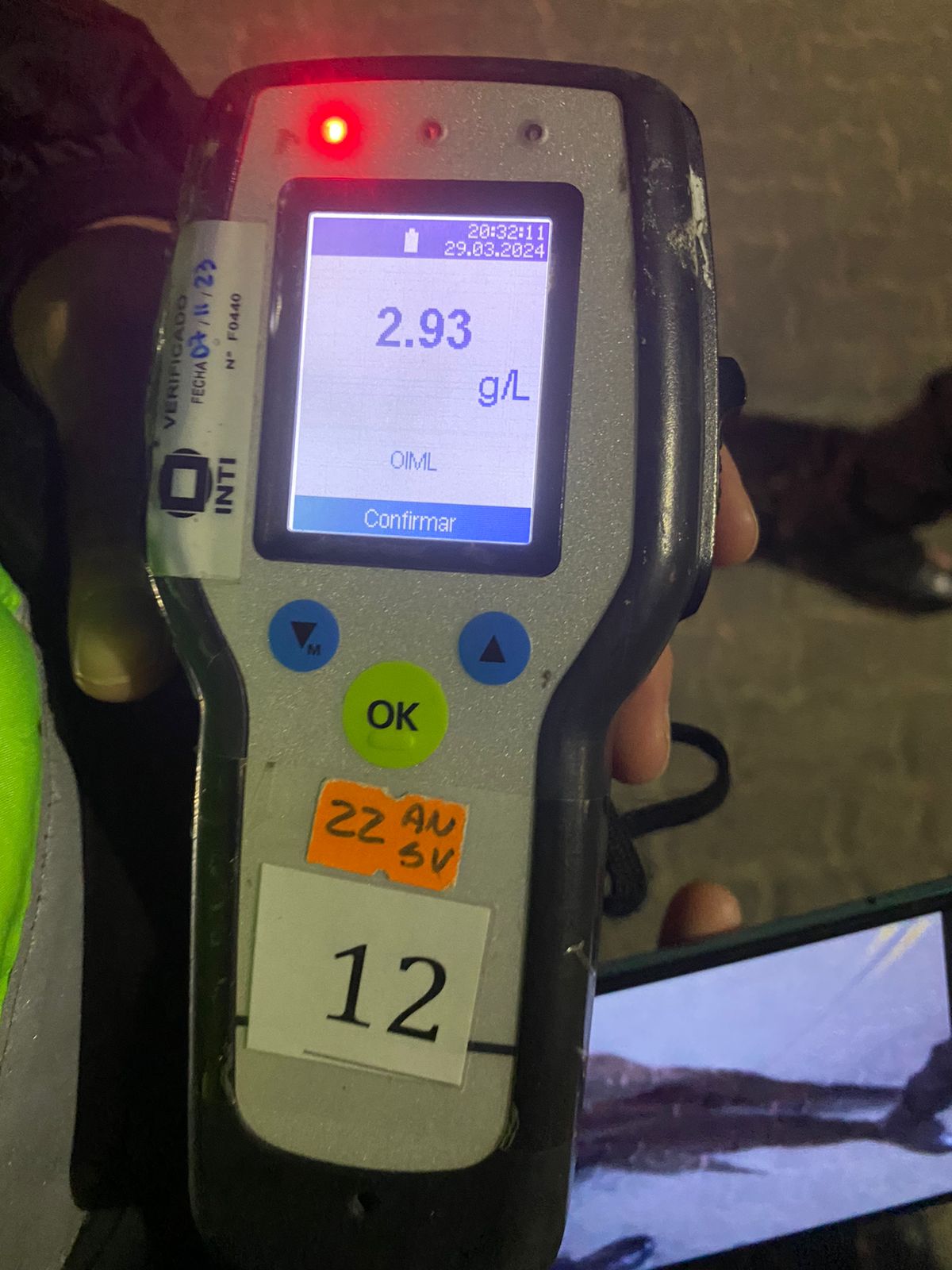 Al llevar adelante la cobertura de la colisión personal policial constata que el conductor del primero de los rodados arroja una alcoholemia positiva de alta graduación (2,93 gl), razón por la cual procede al secuestro del Toyota Corolla ya mencionado, siendo trasladado al corralón policial de Km. 4 y se procede a labrar la correspondiente acta de infracción.