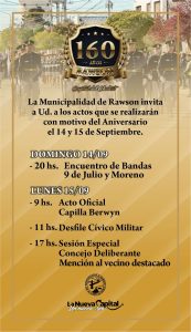 En el marco del 160° aniversario de Rawson, la ciudad se prepara para una celebración que refleja su historia, su crecimiento y el compromiso de la gestión municipal con la comunidad. Este aniversario constituye un hito institucional que fortalece la identidad local y el sentido de pertenencia. La Municipalidad de Rawson invita a la comunidad a participar de los festejos conmemorativos, que se realizarán este lunes 15 de septiembre con un acto oficial y el tradicional desfile cívico-militar, con propuestas culturales y comunitarias.