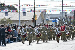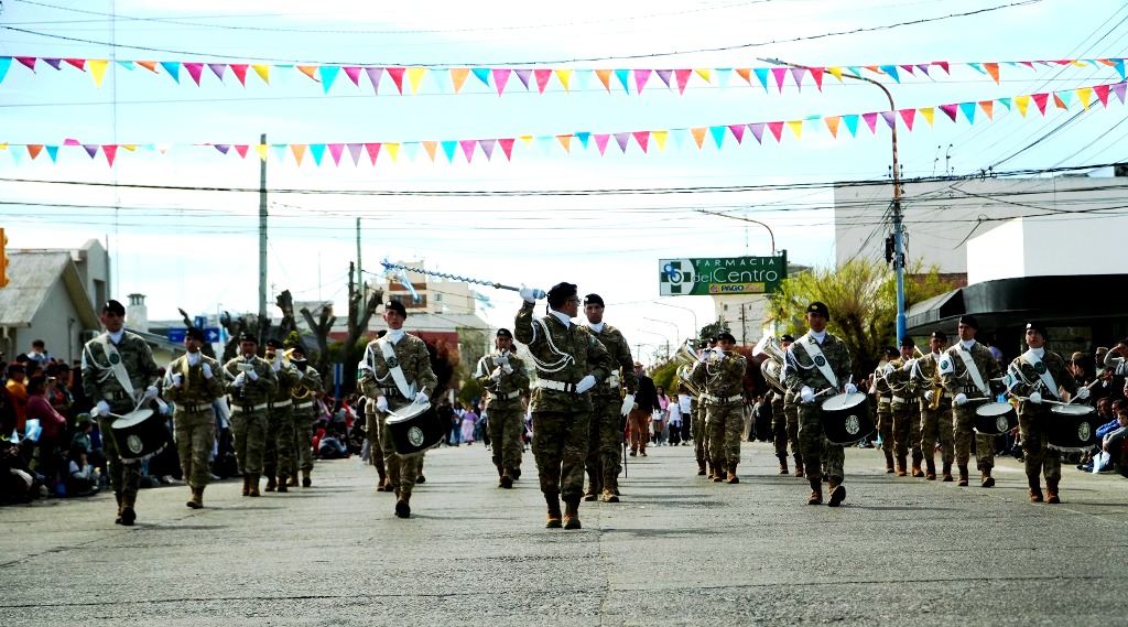 El desfile estuvo acompañado por destacadas bandas militares y policiales, que abrieron y cerraron los distintos bloques del recorrido. Entre ellas se destacaron la Banda de Música de la Fuerza Aérea “Capitán Luis Candelaria” de Comodoro Rivadavia, la Banda Militar “Malvinas Argentinas” del RC Expl 3 de Esquel, la Banda Militar “Combate de San Carlos” del RIMec 25 de Sarmiento y la Banda de la Policía del Chubut, bajo la dirección de Darío Quintraman. La formación musical comenzó con la Banda de Esquel y culminó con la Banda local, interpretando el Himno Nacional y la Marcha de Malvinas, reafirmando el compromiso y la identidad colectiva.