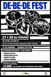 La Fundación Panal Patagonia, junto a la Municipalidad de Rawson y el Centro Cultural Provincial, realizará el ‘De-Be-De Fest’, que tendrá lugar los días 27 y 28 de febrero en el Centro Cultural Provincial. El evento brindará un escenario a jóvenes músicos locales en un espacio de música, arte urbano y danza destinado a toda la comunidad.