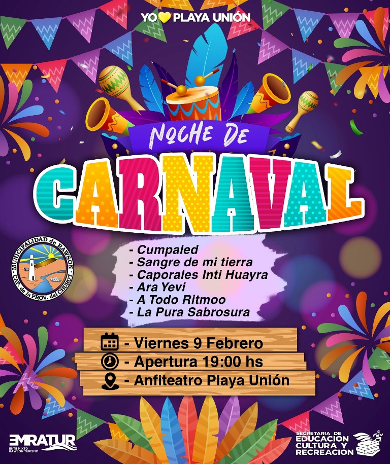 Este viernes 9 de febrero los vecinos y veraneantes podrán acercarse al Anfiteatro de Playa Unión para disfrutar de la noche de Carnavales. La Municipalidad de Rawson invita a la comunidad en general a presenciar desde las 19 horas las pasadas de las comparsas “A Todo Ritmo”, “Ara Yevi”, “Caporales Inti Huayra” y “Sangre de Mi Tierra”. Luego, quedará habilitado el escenario para la presentación de artistas invitados como Cumpaled y La Pura Sabrosura.