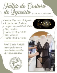 Además, se anunció el inicio del Taller de Costura de Lencería, previsto para el viernes 15 de agosto en la vecinal General Valle. Orientado a mayores de 18 años, se dictará los martes de 16:00 a 18:00 y los viernes de 14:00 a 16:00, durante cuatro semanas. La capacitación estará a cargo de la profesora Carla Ridolfi y, aunque es arancelada, cuenta con el auspicio municipal para garantizar su acceso. Las inscripciones y consultas se realizan al teléfono (280) 4419426.