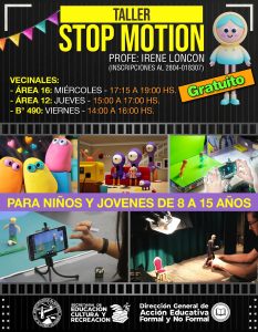 Como novedad, el taller de Stop Motion, originalmente dictado en la vecinal de General Valle, fue trasladado al Centro Comunitario del barrio 490 Viviendas, manteniendo el mismo día y horario, con el fin de promover la proximidad y facilitar la participación de más sectores. Este taller, dictado por la profesora Irene Loncon, está destinado a niños y jóvenes de entre 8 y 15 años, quienes aprenderán a construir objetos con plastilina y a darles movimiento mediante el uso del celular para crear historias audiovisuales.