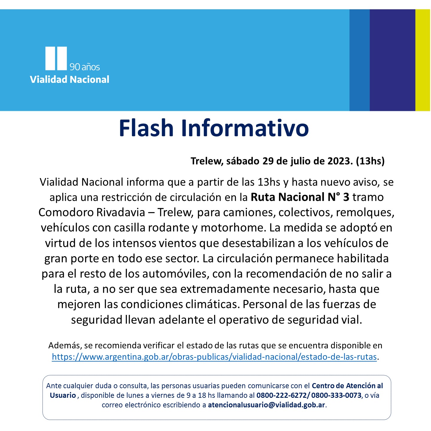 Los fuertes vientos que castigan la costa atlántica de Chubut obligaron a la interrupción de la circulación por la ruta nacional 3 entre Trelew y Comodoro Rivadavia