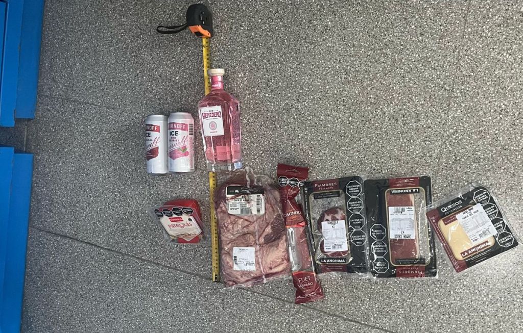 Al llegar la comitiva policial al lugar observa en los casilleros los siguientes elementos (02) latas de Smirnoff ice 473 ml, (01) Gin Herredero 700ml, (01) envoltorio de Queso Feteados 200 grs, (01) envoltorio de jamón Crudo feteados 100 gr, (01) envoltorio de bondiola feteada 100 gr, (01) envoltorio de jamón crudo fuet estilo serrano (01) envoltorio de Tapa de Asado de 1.822 kg (01) envoltorio de queso pategras 0.420 kg, –
