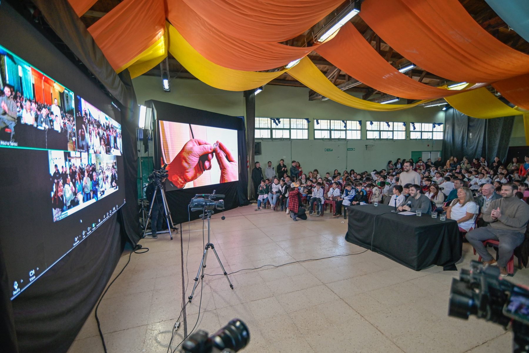 Desde un gimnasio totalmente colmado de alumnos eufóricos, familias y docentes, Torres se puso en contacto con todos los establecimientos educativos beneficiados, acompañados en cada oportunidad por funcionarios del Gobierno Provincial y por sus respectivos jefes comunales.