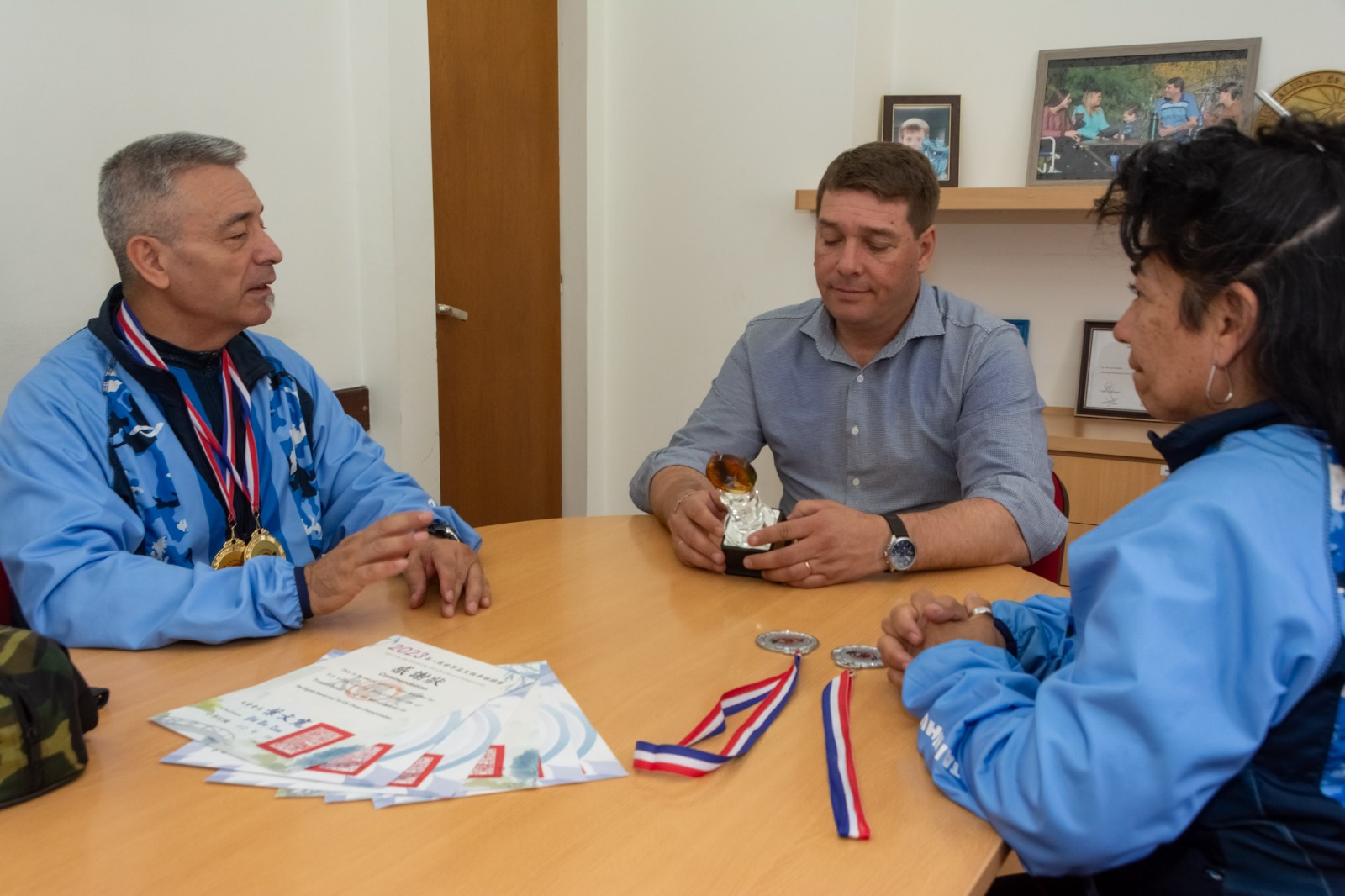 Sandra Cabral y Juan Álvarez Wang que viajaron este mes al Mundial de Taiwán, visitaron al intendente de la ciudad, para ponerlo en conocimiento del desarrollo del Mundial de Tai Chi Chuan y mostrar los premios obtenidos.