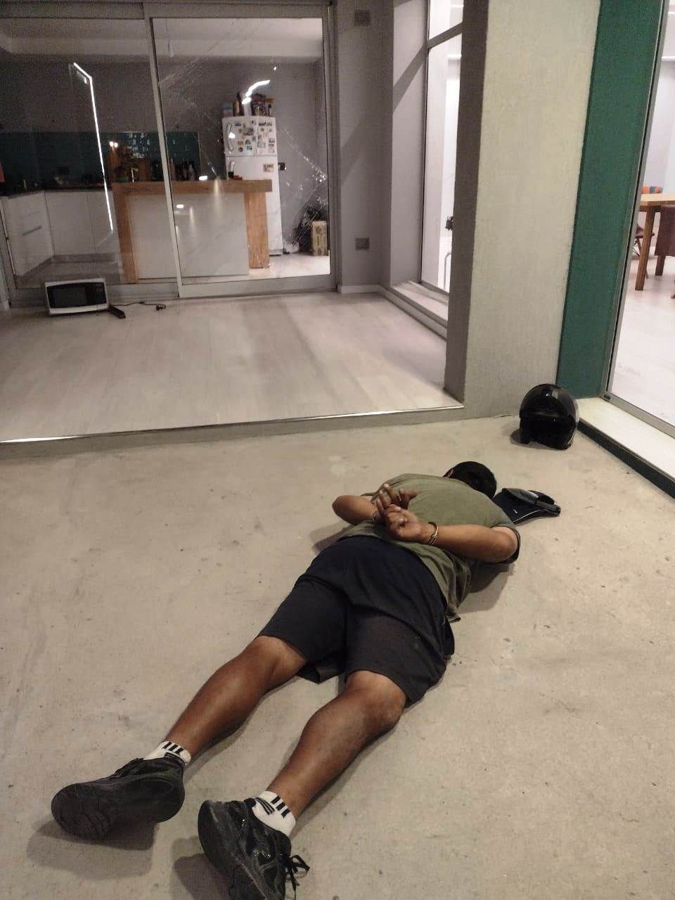 Dicho sujeto al ver la presencia policial, quiere descartarse de otros elementos que tenía en sus bolsillos, (joyas de oro, dinero efectivo, relojes, etc) y quiere darse a la fuga, pero es aprehendió saliendo del domicilio.