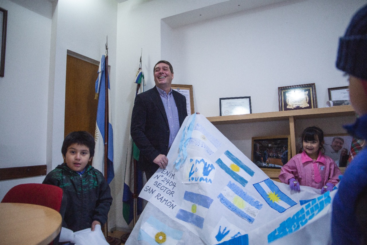 El intendente de Rawson, Damián Biss, recibió en su despacho a la directora de los Jardines de Infantes Municipales, Lidia Miguel, junto a niños de los distintas sedes y sus padres, quienes le entregaron trabajos realizados por el Día de la Bandera.