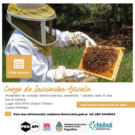 El Gobierno del Chubut, junto al INTA, dictarán un curso gratuito de Iniciación Apícola, a partir del 13 de agosto, en Trelew. La propuesta es teórica, práctica, y presencial.