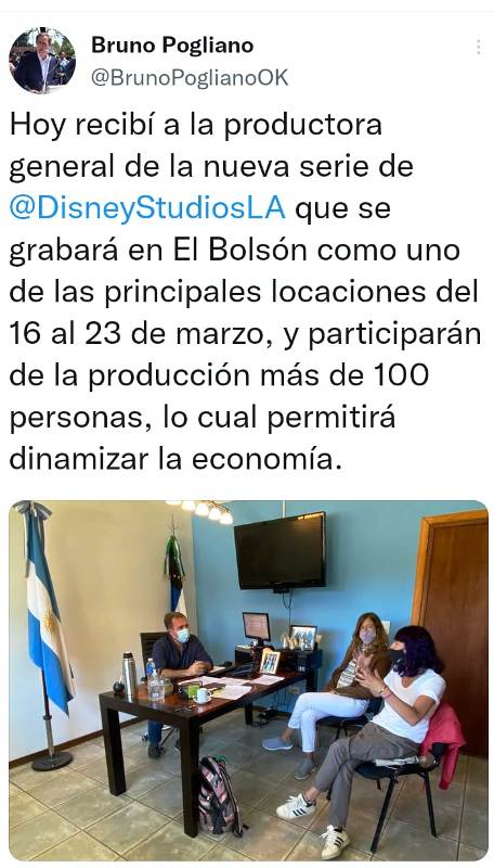El intendente de El Bolsón, Bruno Pogliano, recibió ayer viernes a la productora general de la nueva serie de Disney, que se filmará en la localidad rionegrina enclavadaen la comarca andina del paralelo 42 que comparten Chubut y Río Negro.