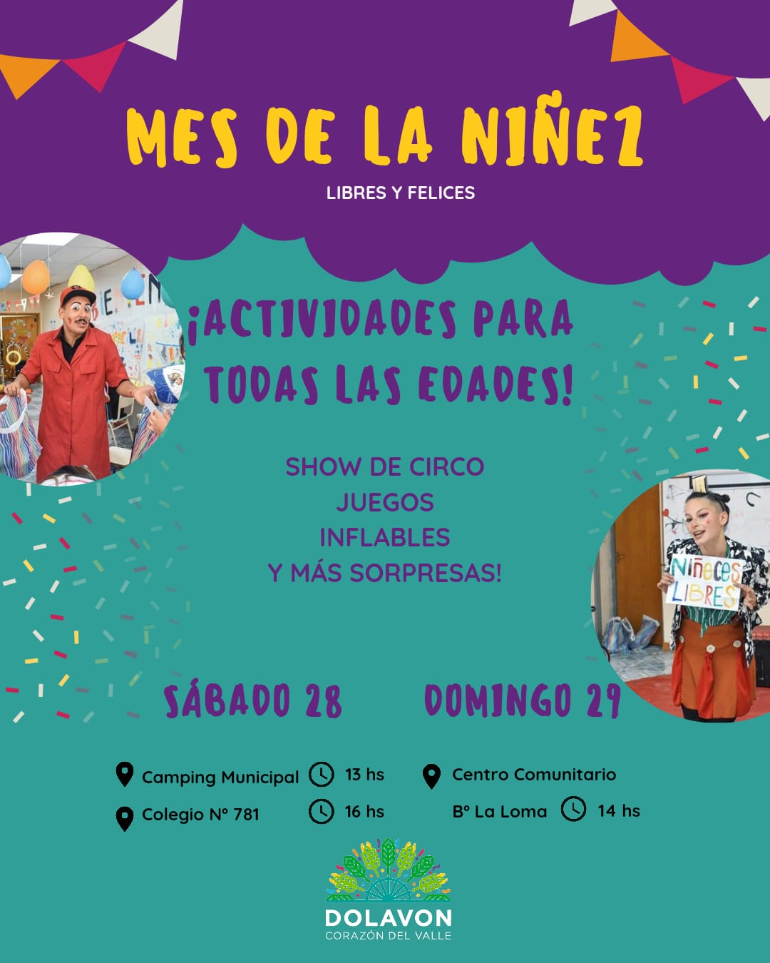 Habrá juegos, inflables, el show circense de Baldomero y Papelito, con sorpresas y regalos saludables incentivando la alimentación sana y la salud bucal. La municipalidad organizó los festejos que comenzarán el sábado 28 de agosto desde las 13 horas, en el Camping Municipal continuando, a las 16 horas, en la Escuela Provincial Nº 781. Para el domingo 29 de agosto a las 14 horas, los shows se trasladarán al Centro Comunitario del barrio La Loma