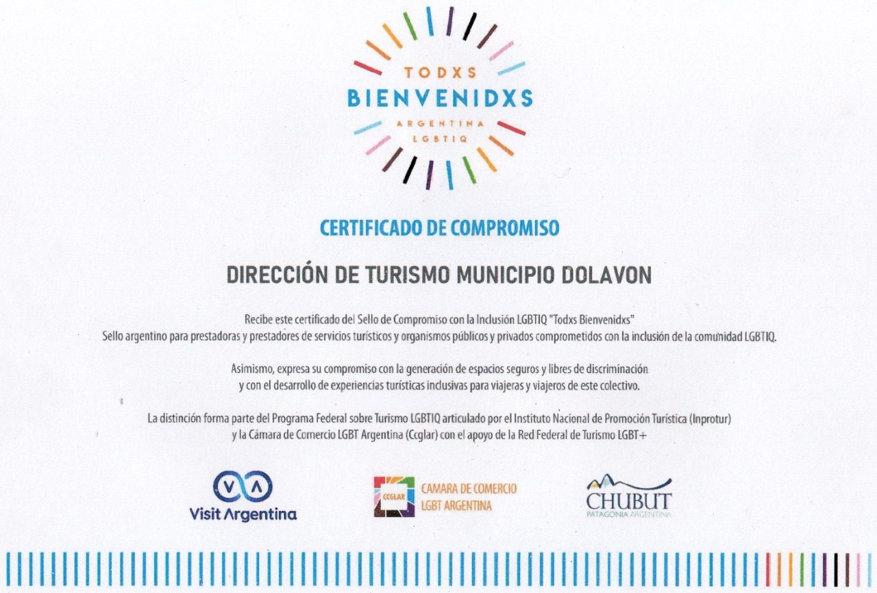 Desde la Dirección de Turismo de la municipalidad de Dolavon confirmaron la recepción del certificado que otorga el Sello Argentino de Compromiso con la Inclusión LGBTIQ “Todxs Bienvenidxs”, para prestadoras y prestadores de servicios turísticos, organismos públicos y privados.