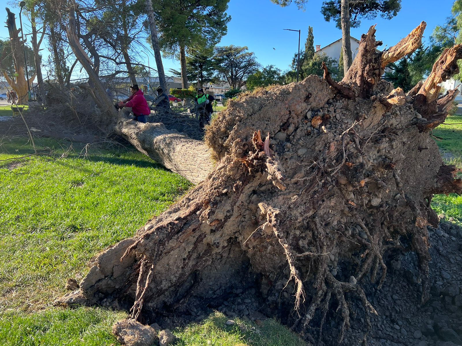 El secretario informó que a causa de las rafagas de viento que llegaron a los 100 km/h por la noche cayeron dos pinos grandes en la plaza central que ya están siendo retirados por las cuadrillas municipales de hambiente y obras publicas.