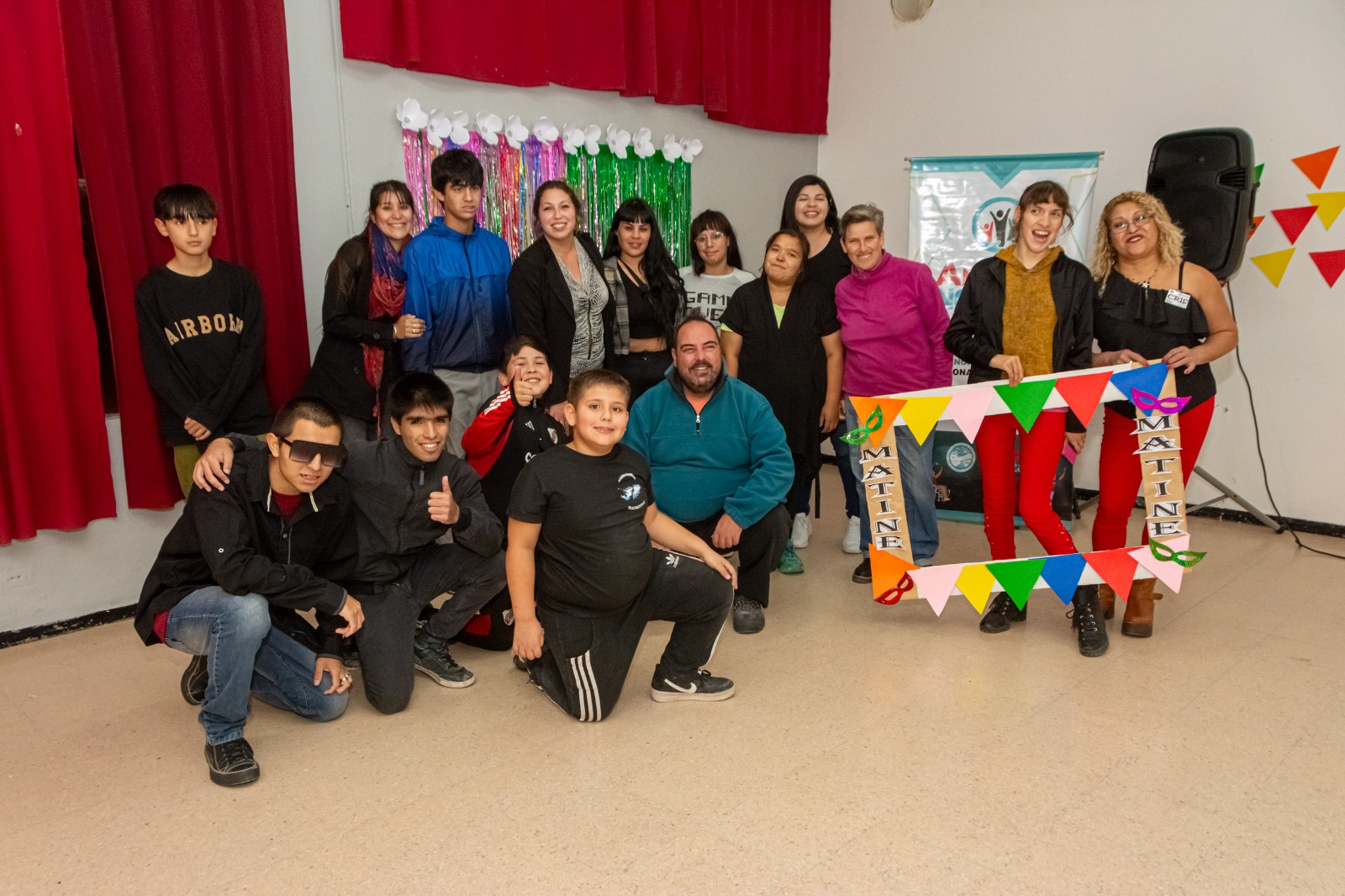 La Matiné Inclusiva se desarrolló en el Círculo Social y Cultural Rawson y contó con la asistencia de la responsable del área municipal, Rocío Duarte Malla junto al equipo de trabajo y jóvenes con discapacidad acompañados por sus familias.
