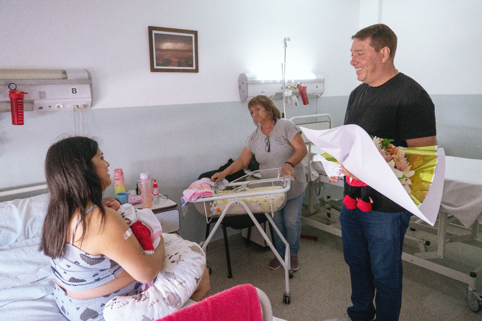 Este sábado por la mañana, el intendente Damián Biss visitó a Aymara Valentina, la primera bebé nacida en 2026 en Rawson. La pequeña nació el 2 de enero a las 16:55 horas en el Hospital Santa Teresita, con un peso de 3800 gramos.