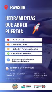 La Municipalidad de Rawson, en articulación con Fundación Pescar y Pan American Energy, invita a participar del taller “Mi Futuro, Mi Trabajo”, que se realizará este jueves 6 de noviembre, de 14 a 16 horas, en la Cámara de Industria y Comercio de la ciudad.