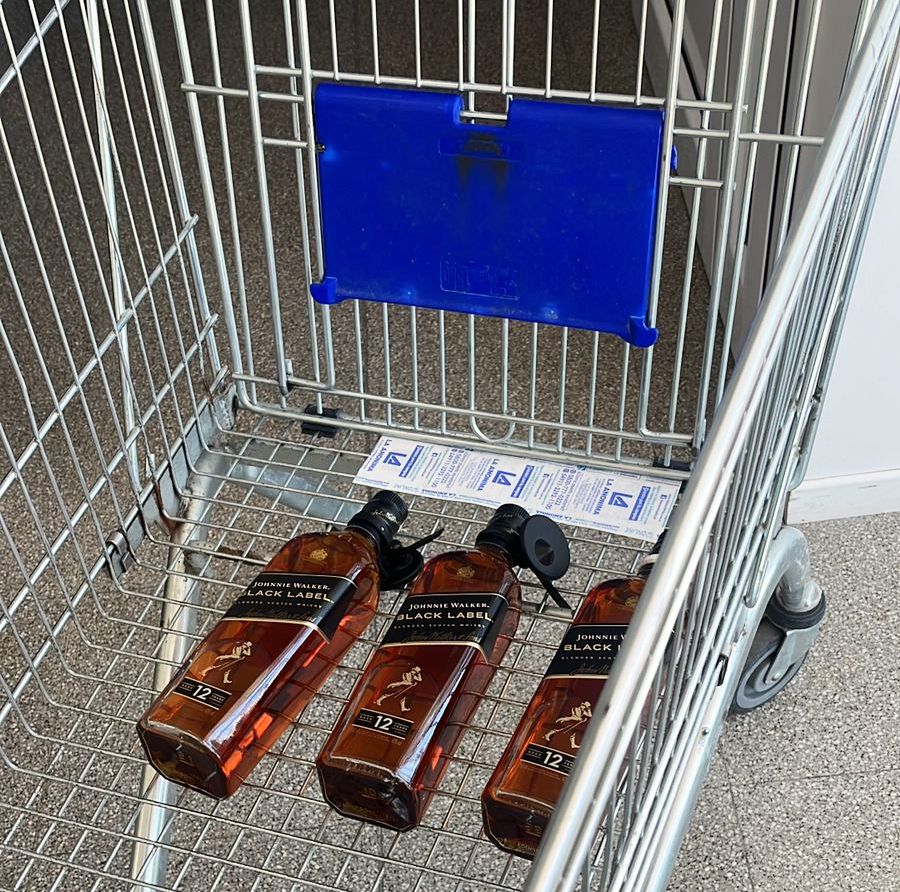 Ahí advierten que el individuo portaba tres botellas de whisky marca BLACK LABEL de 750 ml.