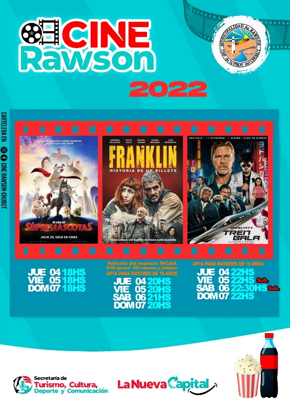 Esta semana de estreno en el Cine Teatro Rawson tendrá al film central “Tren Bala” con el rol protagónico del reconocido actor Brad Pitt, además de la película nacional “Franklin, historia de un Billete” y la segunda semana de proyección del film infantil “Liga de Supermascotas”.