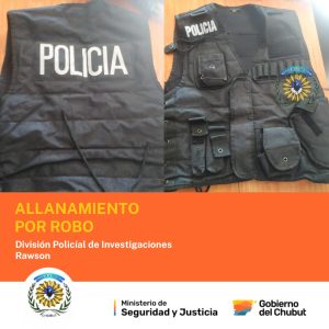 Este viernes 20 de febrero, en horas de la mañana, personal de la División Policial de Investigaciones Rawson, llevo a cabo un allanamiento y registro domiciliario contra un inmueble ubicado en el Barrio Rio Chubut, logrando recuperar elementos que fueron sustraídos en el curso de esta semana, de un inmueeble del Barrio San Ramón.