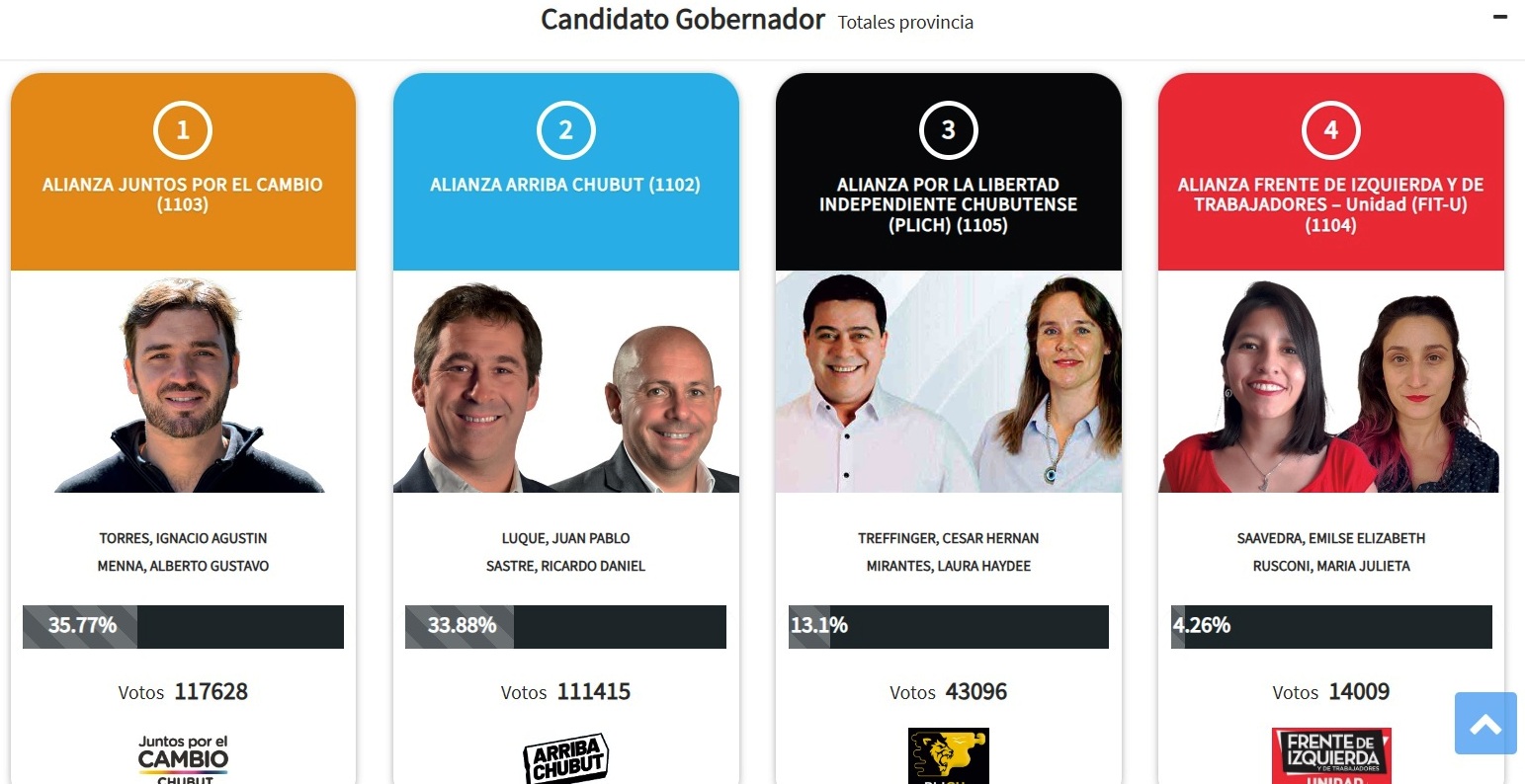 El candidato de la alianza Arriba Chubut logró 111.404 votos lo que equivale a un 33,38%.