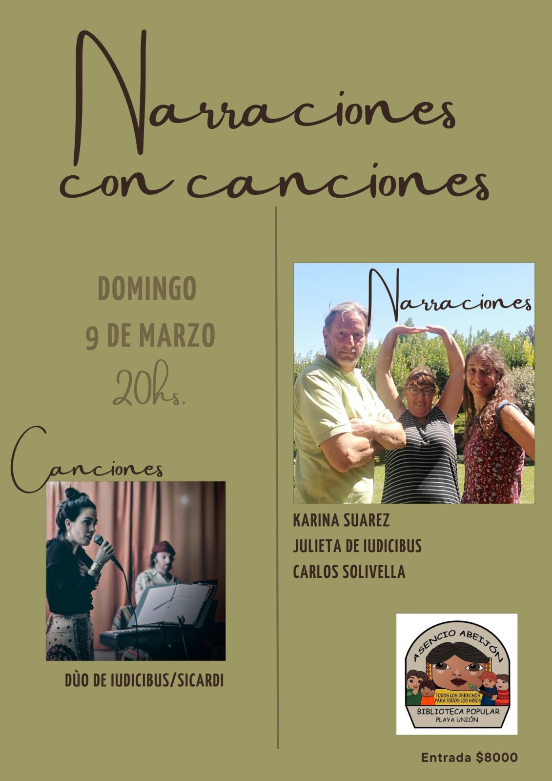 En este mix de expresiones musicales y escénicas, las melodías estarán a cargo del dúo Laura Luz De Iudicibus y Juan Sicardi. Y la puesta en escena de diversas historias, será llevada a cabo por los actores Karina Suarez, Carlos Solivella y Julieta De Iudicibus. Una noche distinta, para disfrutar.