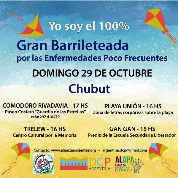 La organización civil Alianza Argentina de Pacientes (ALAPA) –que cuenta con representación en Chubut– impulsa la Barrileteada que se realizará en todo el país desde hace años. ALAPA busca proteger, hacer respetar y defender los derechos de pacientes y personas con discapacidad; con educación en salud familiar y promoviendo el desarrollo científico nacional, la inclusión, la salud integral y el bienestar psico cultural de quienes padecen una Enfermedad Poco Frecuente.