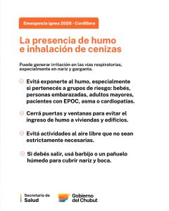 Debido a los incendios que afectan la Comarca Andina y la persistente presencia de humo y cenizas, el Gobierno del Chubut, a través de la Secretaría de Salud, brindó recomendaciones para el cuidado de la población en la zona.