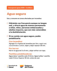 La Secretaría de Salud del Chubut detalló una serie de medidas de protección ante la presencia de humo, recaudos para el consumo de agua segura y consejos para cuidar la salud mental.