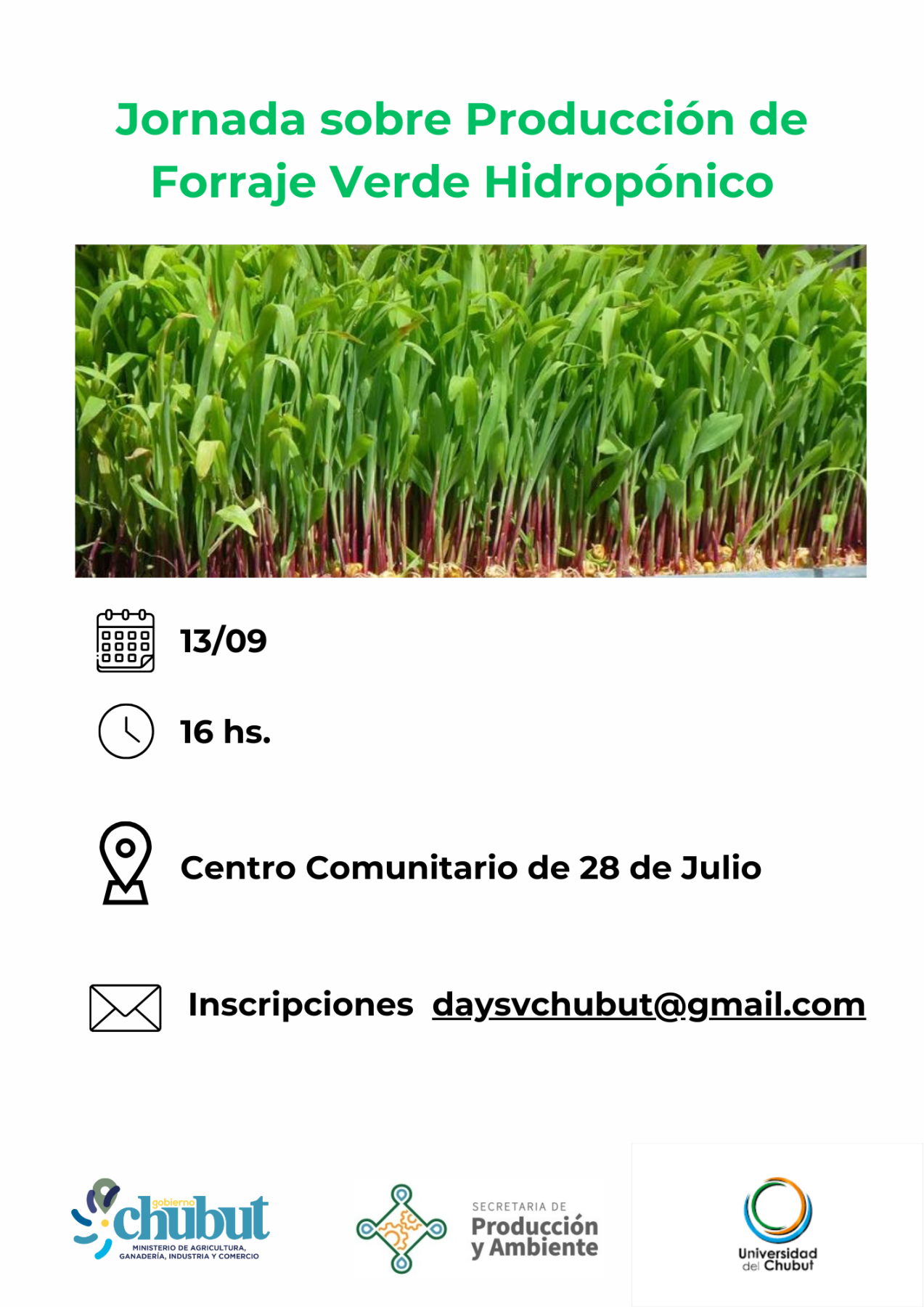 El Gobierno Provincial y la Universidad del Chubut, llevará adelante junto al Municipio de 28 de Julio, la primera Jornada sobre Producción de Forraje Verde Hidropónico en dicha localidad valletana.