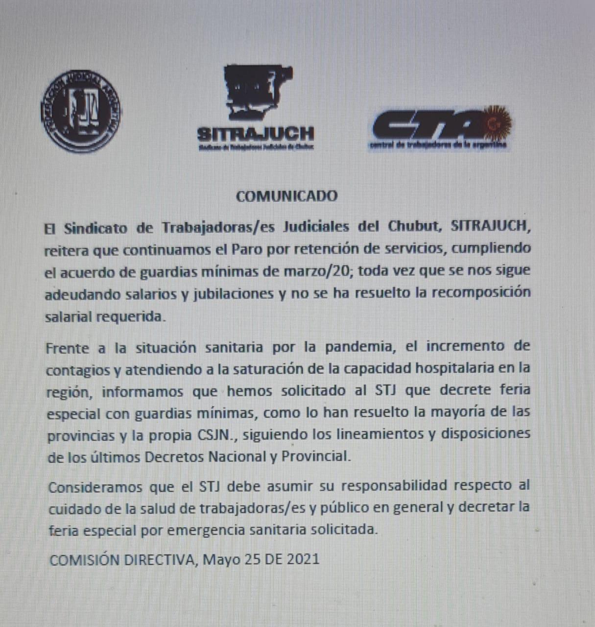 Lo reclamaron la Superior Tribunal de Justicia de la provincia ante la situación epidemiológica por el covid-19 y los últimos decretos emitidos por el Gobierno nacional y el provincial. Le piden al máximo organismo de la justicia chubutense que actúe en consonancia con los decretos y resguarde el cuidado de salud del personal y el público en general.