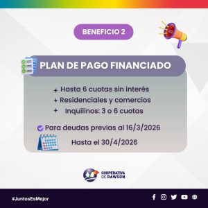 La Cooperativa de Servicios Públicos de Rawson continúa incorporando herramientas para acompañar a sus usuarios y facilitar la regularización de deudas, especialmente en vísperas a los meses de mayor consumo. Para ello, habrá tres beneficios clave para ponerse al día.