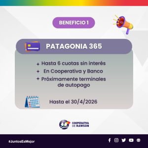 Por un lado, se firmó un convenio con el Banco del Chubut que permite abonar deudas mediante la tarjeta de crédito Patagonia 365 hasta 6 cuotas sin interés. El beneficio está vigente hasta el 30 de abril de 2026. Para mayor cantidad de cuotas, se mantiene la financiación que aplica la entidad bancaria de acuerdo a sus condiciones vigentes.