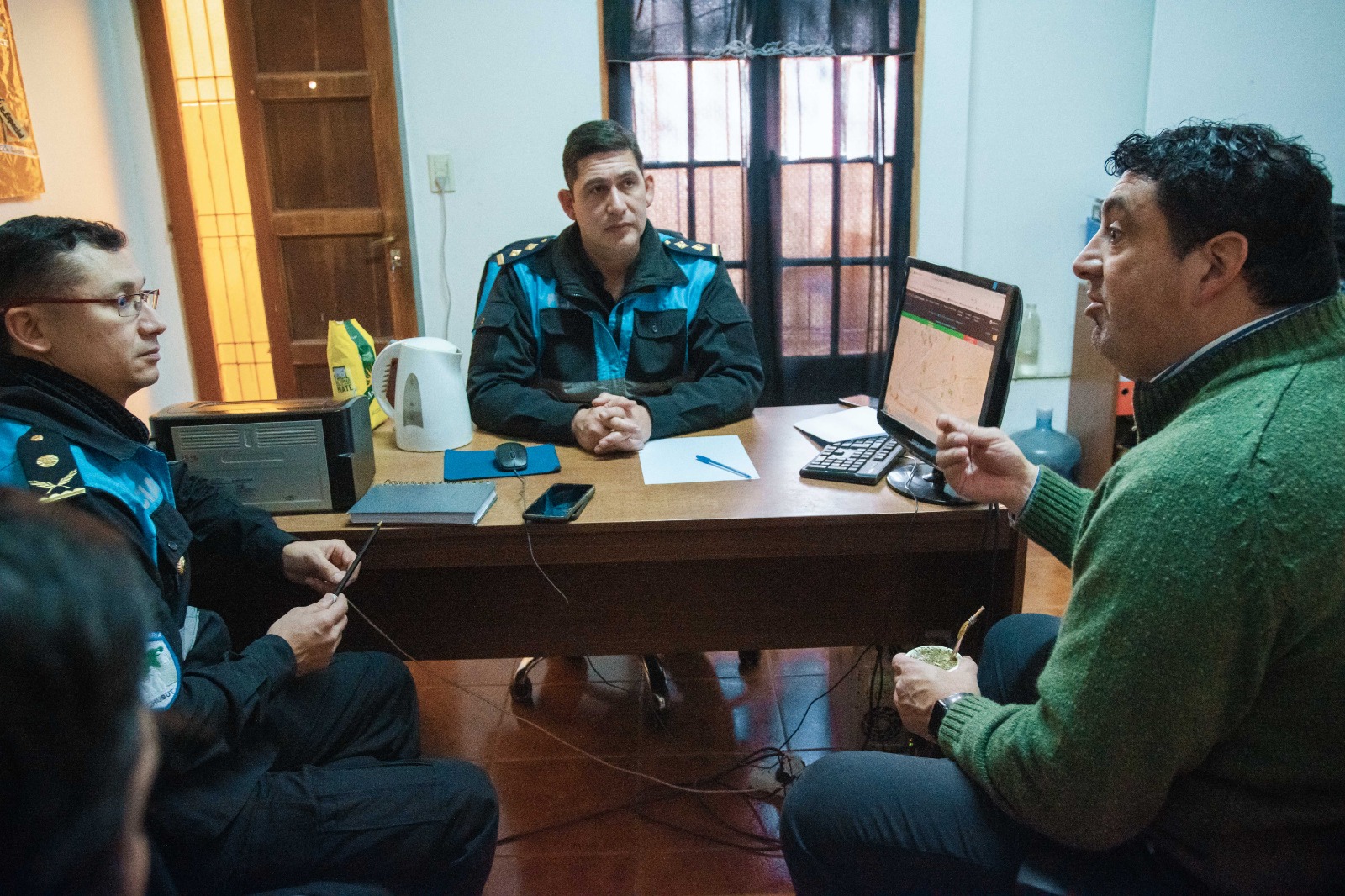 En ese sentido, el titular de la cartera de Ambiente Municipal, Miguel Larrauri, junto a Martín Muñoz, integrante de su equipo de trabajo, mantuvieron un encuentro con los responsables de las distintas áreas de la Policía de la Provincia del Chubut, Miguel Arancibia por el Centro de Monitoreo de Rawson y con el comisario David Curín, titular de la Policía Comunitaria capitalina.