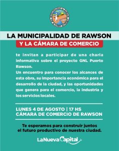Con el propósito de promover la participación ciudadana en iniciativas clave para el desarrollo local, la Municipalidad de Rawson, a través del Ente Mixto Rawson Turístico (EMRaTur) y en conjunto con la Cámara de Comercio, convocan a vecinos, comerciantes y empresarios a una charla abierta el 4 de agosto a las 17 horas en la sede de la Cámara de Comercio local. El encuentro tiene como objetivo informar sobre el proyecto GNL Puerto Rawson y su incidencia en el crecimiento económico y productivo de la ciudad.