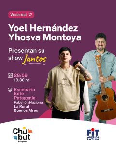 Entre las principales actividades diagramadas por el Gobierno del Chubut está la presentación en vivo de Yoel Hernández y Yhosva Montoya. Los artistas de la provincia se presentarán en dos escenarios el día domingo a las 17:30 horas en el Escenario Externo “Elegí Argentina” y a las 19:30 en el escenario Stand Patagonia.