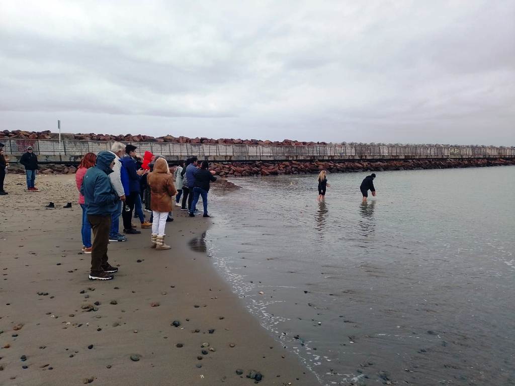 Aunque el día se presentó lluvioso, en ese momento el clima brindo la tregua y todo el cortejo hizo una ronda sobre la arena, metros antes del agua y allí surgieron los relatos. Beba detalló como fueros los últimos días internado en Buenos aires, donde afrontó con éxito su operación y siempre mantuvo el espíritu alto y el excelente ánimo y humor.
