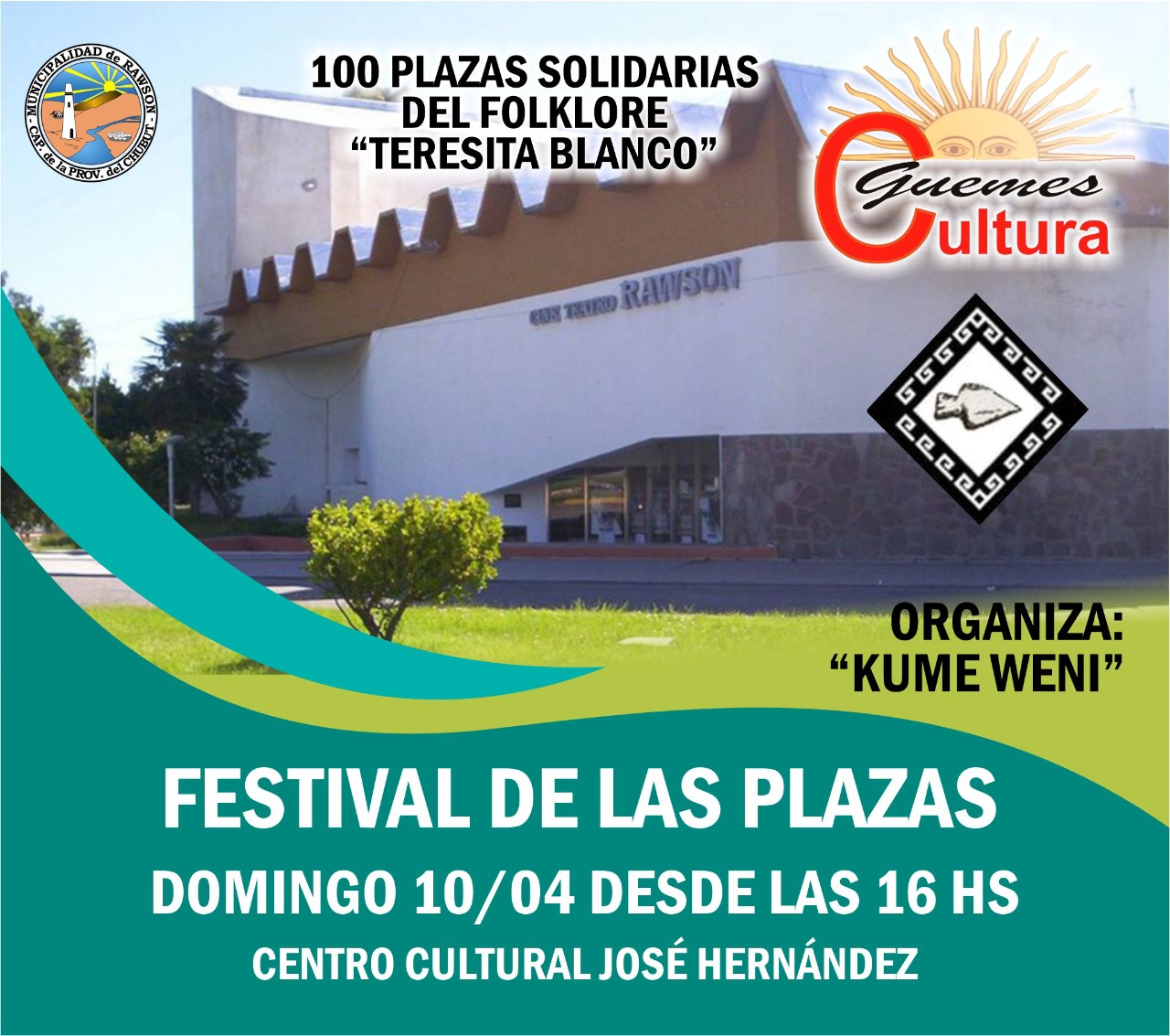 La Municipalidad de Rawson, a través de la Secretaría de Turismo, Cultura, Deporte y Comunicación, acompañará este domingo al evento 100 Plazas Solidarias del Folklore “Teresita Blanco”, organizado por Kume Weni, que se realizará en el Centro Cultural “José Hernández”.